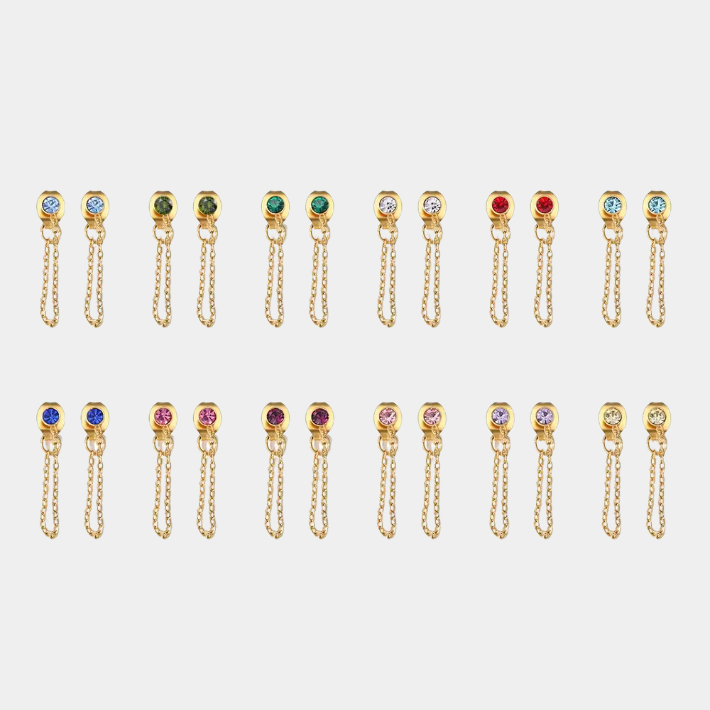 Express your unique style with our stainless steel birthstone chain earrings, plated in enduring PVD gold for lasting radiance. Customize your look by choosing your birthstone or that of a loved one, adding a personal touch to your ensemble. These earrings are not just accessories; they're symbols of cherished connections and timeless elegance.