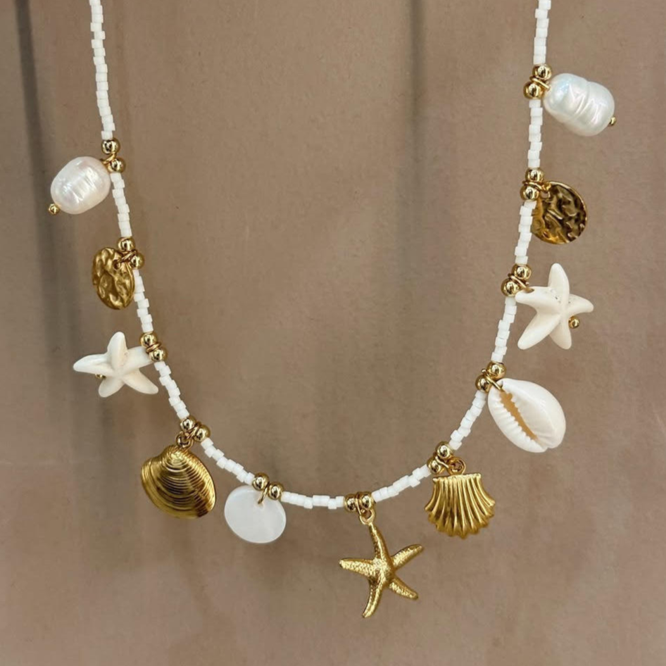 Inspired by the small white beaches of Clifton, this necklace captures summer in every detail. The Clifton Charm Necklace is strung with tiny white beads and finished with golden and natural charms — including shells, pearls, starfish, and ocean treasures.