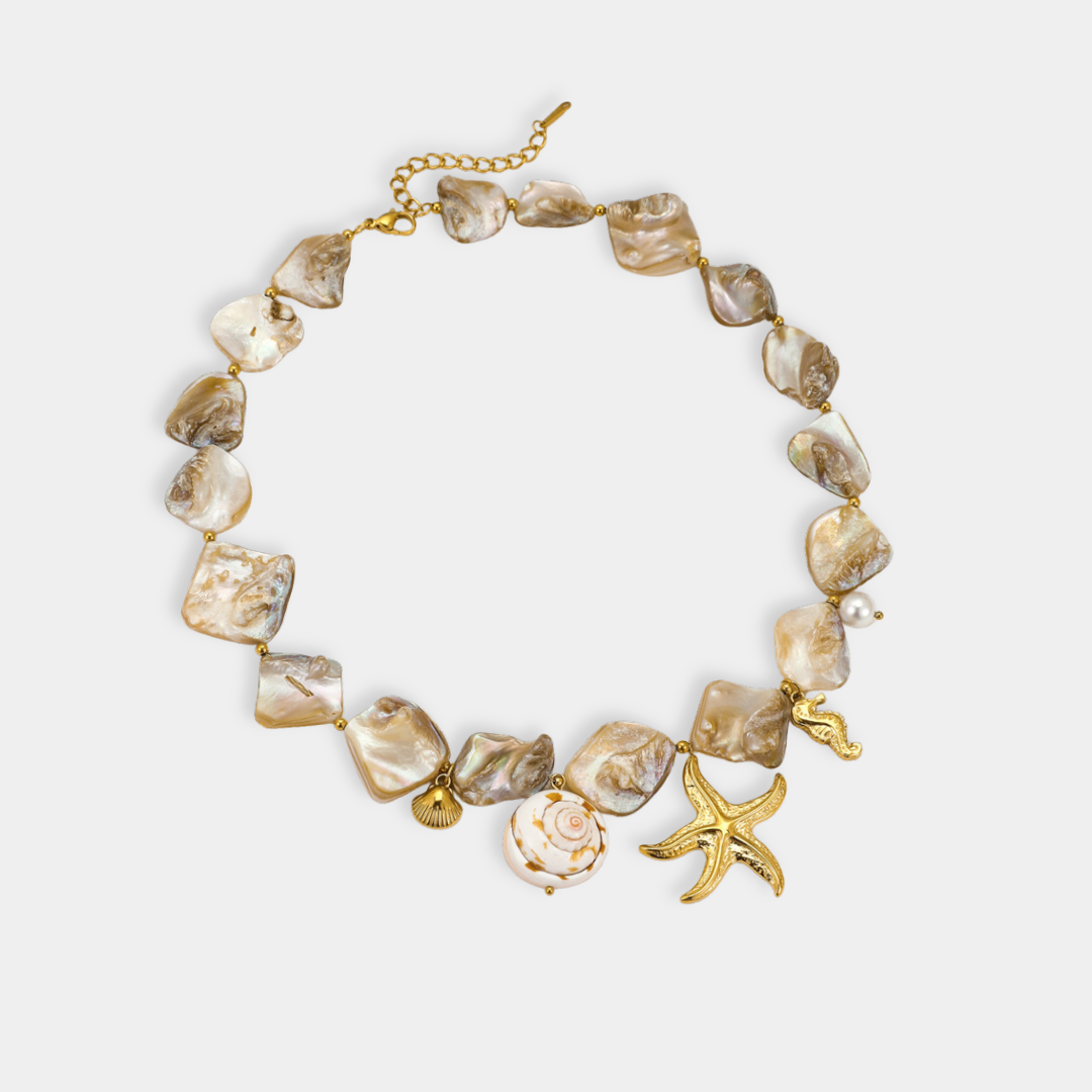 Inspired by the ocean, the Chunky Clifton Necklace features irregular shell-like beads and golden ocean charms — a starfish, shell, seahorse, pearl, and spiral shell.