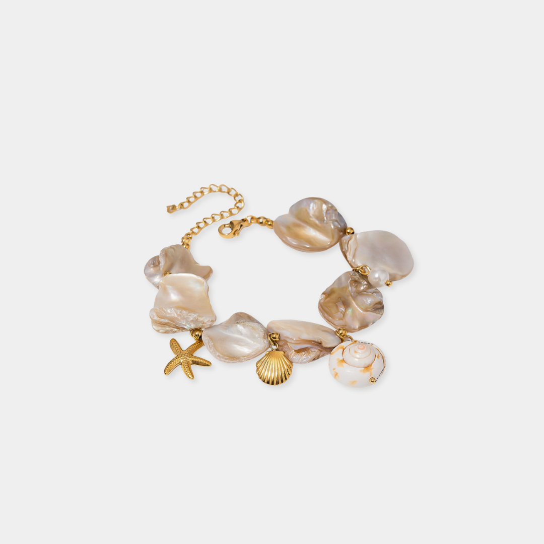 Inspired by the ocean, the Chunky Clifton Bracelet features irregular shell-like beads and golden ocean charms — a starfish, shell, and spiral shell.