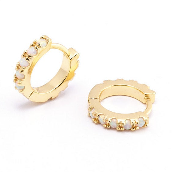 These gorgeous huggie hoops got white opal stones on the back and front.